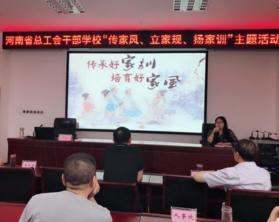为推动学校精神文明创建工作深入开展,弘扬中华优秀传统文化,营造积极向上的家庭氛围,2018年6月28日上午,河南省总工会干部学校在综合楼三楼教室开展了“传家风、立家规、扬家训”主题活动。党委书记、校长吴新锋、副校长周铸生、王军、郭国红、董郑黎和学校全体老师参与了本次活动。